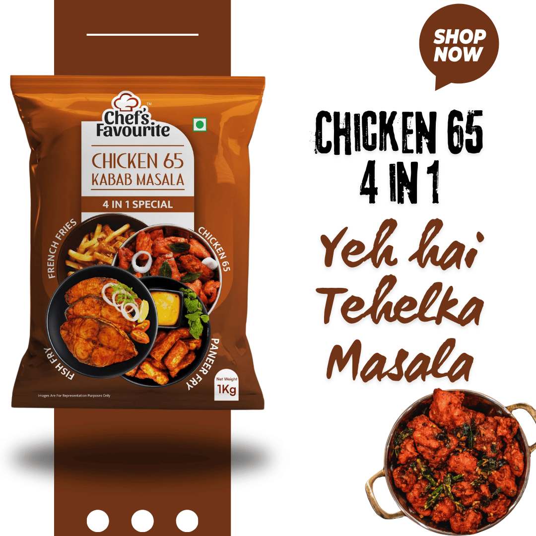 Chef’s Favourite Chicken 65 – 4 in 1 Masala (1kg pack) One masala, four delicious dishes! With our Chicken 65 – 4 in 1 Instant Masala, you can effortlessly prepare Chicken, Paneer, Fish, and Potato Fries with just three simple steps – Cut, Mix, and Fry! No extra seasoning needed, just authentic, restaurant-style flavors in minutes. Perfect for home kitchens & food businesses! (Box of 20 packs )
